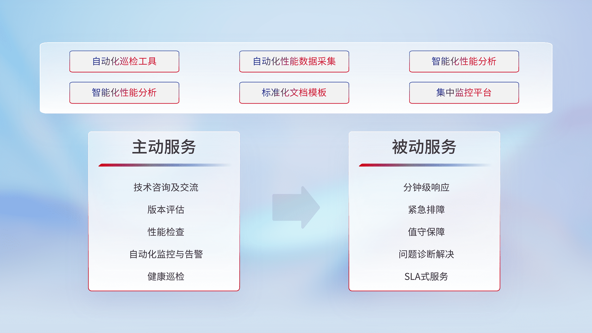 智能化工具和标准化文档,,,保障服务质量,,,,提供主动服务(包含技术咨询、、版本评估、、、性能检查、、、自动化监控与告警、、、、健康巡检)和被动服务包含(分钟级响应、、紧急排障、、、值守保障、、、、问题诊断解决、、、、SLA服务)。。。